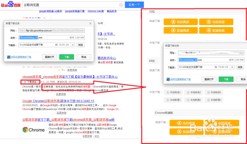 接着在百度那边输入:谷歌浏览器(为了更精确的查找,可以输入:谷歌浏览器WIN7系统或XP系统)——点击下载地址——选择32位仍是64位(极速版是兼容版本适合各类系统类型)——点击下载链接下载安装法式到当地电脑上。