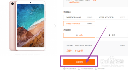 点击选择好小米平板4的设置装备摆设和颜色,点击下方的【当即预约】