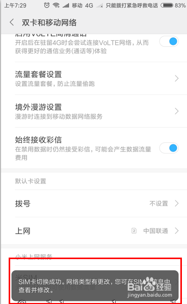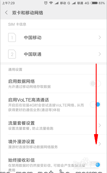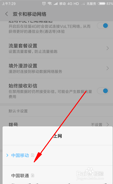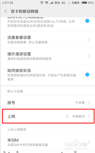 进入双卡和移动收集选项界面后,将菜单标的目的下翻,找到默认卡设置。