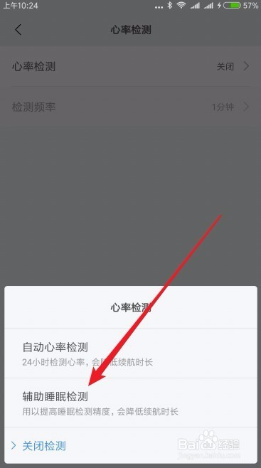 接着会在页面下方弹出一个心率检测的菜单,在这里选择“辅助睡眠检测”菜单项。