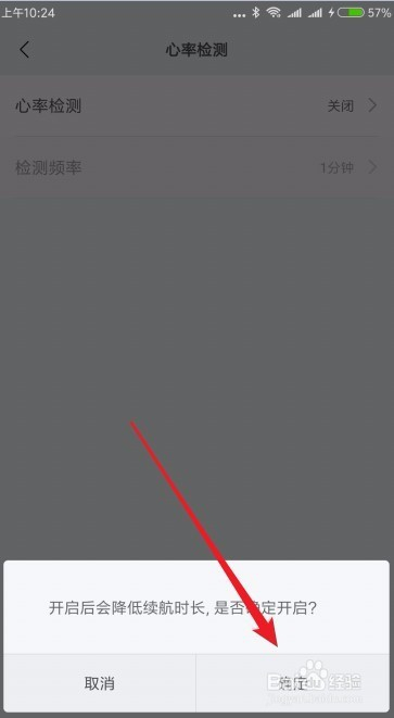 这时会弹出一下可能会降低续航的提醒,我们点击“确定”按钮就可以了。如许我们的小米手环3就可以更精确的检测我们的睡眠质量了。