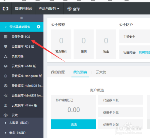 首先打开阿里云的节制台,跳转页面之后,在页面左侧找到如图二的标识表记标帜点击;之后点 ‘云办事器 ECS’;