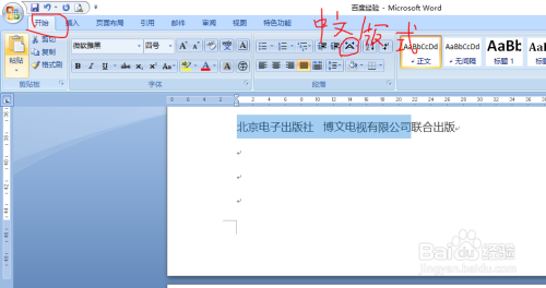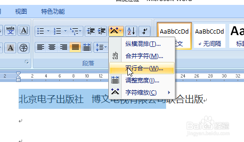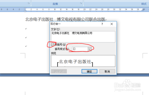 在word文档中输入需要归并为一行的两行文字,此处需要将“海说神聊京电子出书社 博文电视有限公司”归并为一行