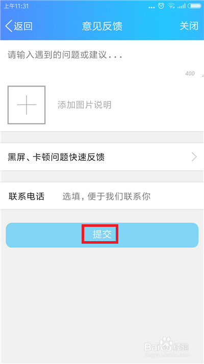 在反馈界面中填写本身需要反馈的问题并添加上相关图片,点击【提交】期待官方处置即可。