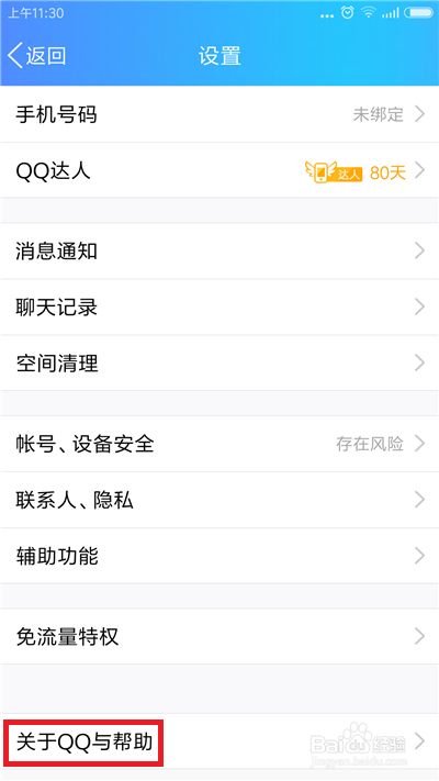 在设置界面中找到最下方的【关于QQ与帮忙】并点击。