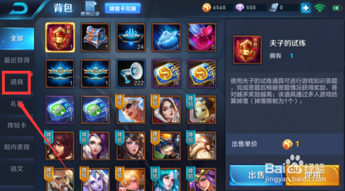 背包的页面,点击道具这一项。