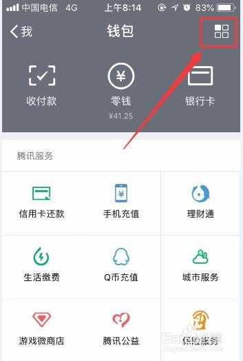 进入我的钱包后,点击钱包页面右上角的导航图标进入付出中间页面。