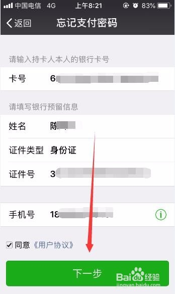 然后按页面要求输入我们的银行卡号、小我信息以及预留手机号码,然后点击下一步。