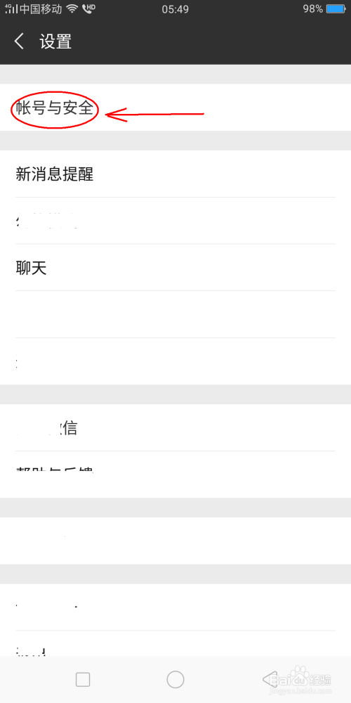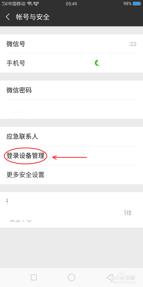 在帐号与平安页面可以看到“登录设备办理”点击它。(如下图)