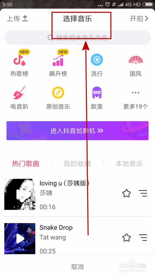 在音乐拔取界面我们可觉得本身的抖音视频选择一个配乐。