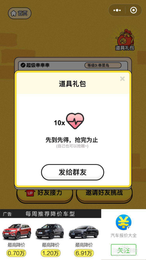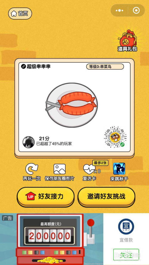 我们在游戏竣事的时辰,第一次,我们可以把超等串串串的游戏分享到微信里的老友,他们是可以点击链接进去帮忙我们续命的,看看你们一路可以缔造出多高的分数。