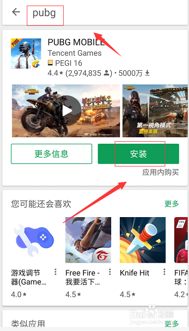 - 3搜索框输入pubg搜刮,就可以找到了,点击安装按钮,如下图所示