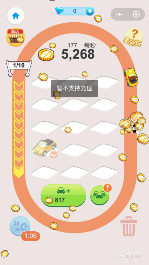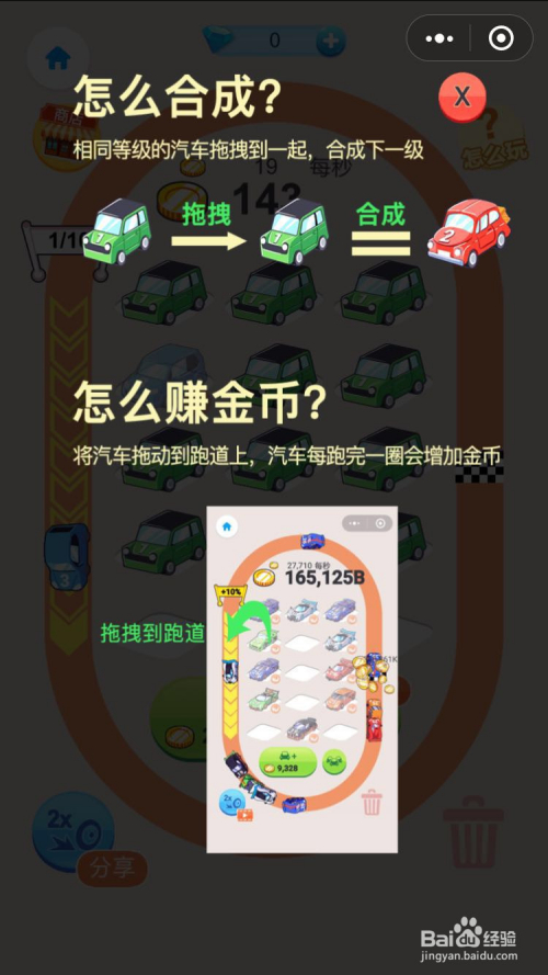 汽车富翁页面右下角的问号,有一个教程的指导,很轻易理解,按金币产出轿车(都是低品级)然后合当作合当作,变的越来越贵的好的汽车,放到跑道里,一圈跑完就有金币,金币有了干嘛呀,当然是继续买车咯,继续买车继续合当作继续跑圈。。周而复始。