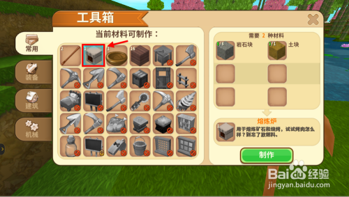 采集石头和土壤(用铲子挖比力快)然后在工作台上合当作熔炉。