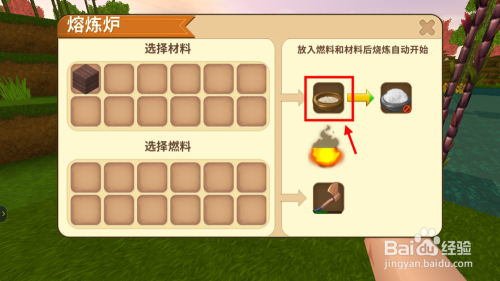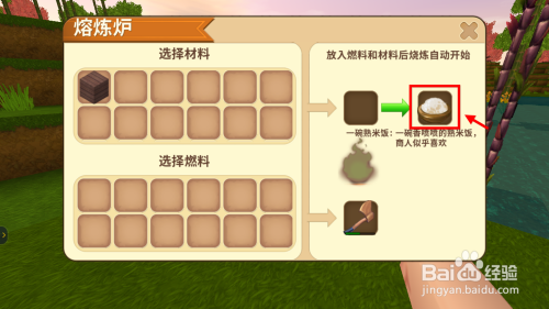 将生米饭放到熔炉里进行加热,添加燃料后期待一会就酿成熟米饭了。