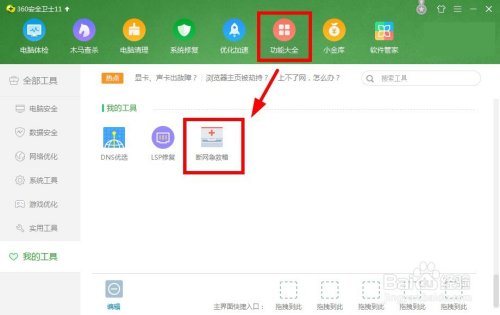 若是还有故障的话,那么打开360安全卫士,找到“功能年夜全——断网急救箱”