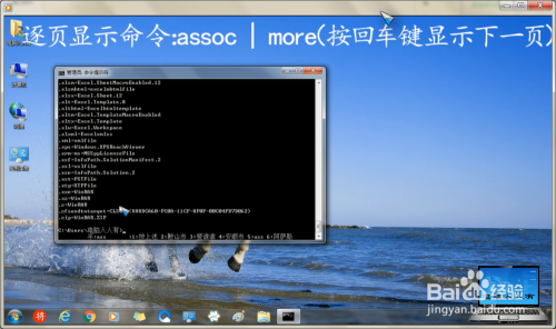 如要逐屏显示扩展名联系关系可以输入此号令:assoc | more →然后,按一次回车键,显示一屏,直至竣事。