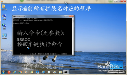 输入号令(不带参数)assoc →按回车键执行号令,显示当前所有扩展名联系关系的法式(一屏到底)。