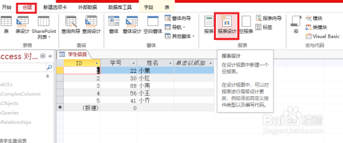 双击打开阿谁表之后,点击上面的【建立】,在报表选项组里选择【报表设计】。
