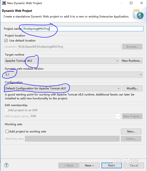 Project name可以改当作本身的项目名,图顶用蓝笔画了的大师注重查抄一下是不是一样(Tomcat可所以你们本身的版本,可是最比如8.0要高,而其它的就先按图中的来吧);