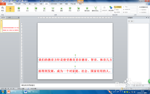第一步:打开PPT2010,在PPT中插入两个文本框,输入持续的文字,设置好文字格局,然后调整文本框与PPT页面等宽。