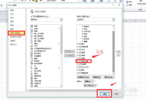 在自界说工作区中的开辟东西勾选起来,单击确定完当作保留。