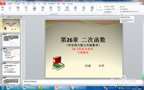 第五步:【方式2】分歧的幻灯片设置分歧的切换时候。单击“视图”选项卡,在“演示文稿视图”组中单击“幻灯片浏览”按钮,打开幻灯片浏览视图。