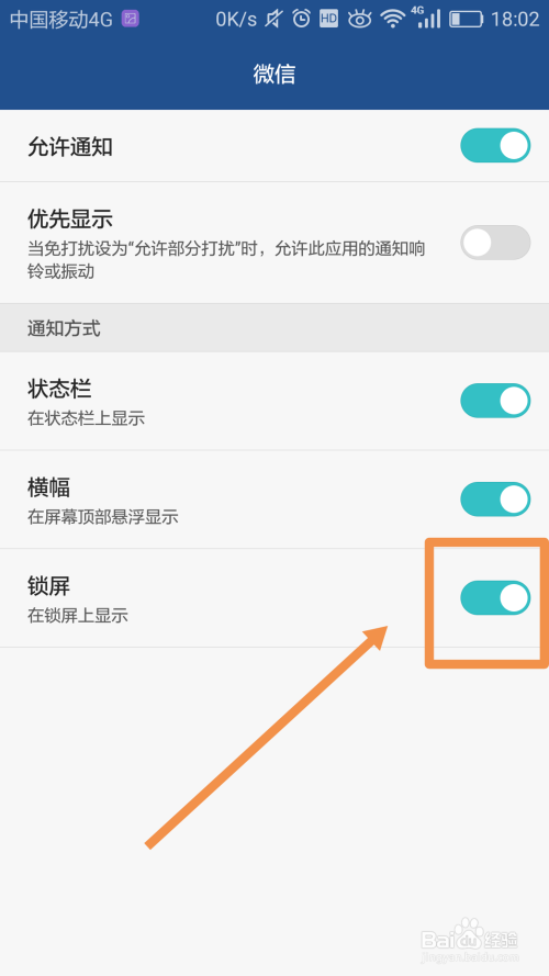 然后在【通知体例】栏下,找到【锁屏】并点击后面的开关按钮,将微信的锁屏通知体例开启,如图: