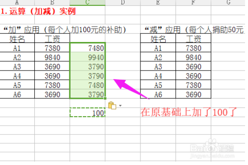 你要做的是将如图所示的工资进行复制粘贴到旁边,作为对比,接着,在空白单位格,输入100,进行复制,然后,在适才作为对照的数据上鼠标右击,在选项中,选择选择性粘贴,如图所示