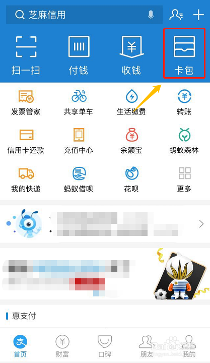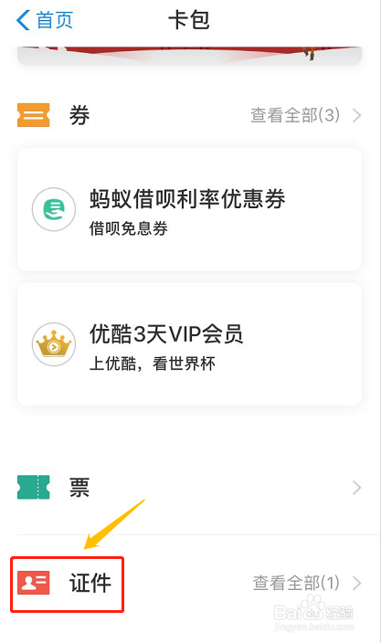 打开付出宝APP今后,找到右上角的"卡包",然后在卡包页面的最下方点击"证件"选项,如下图...