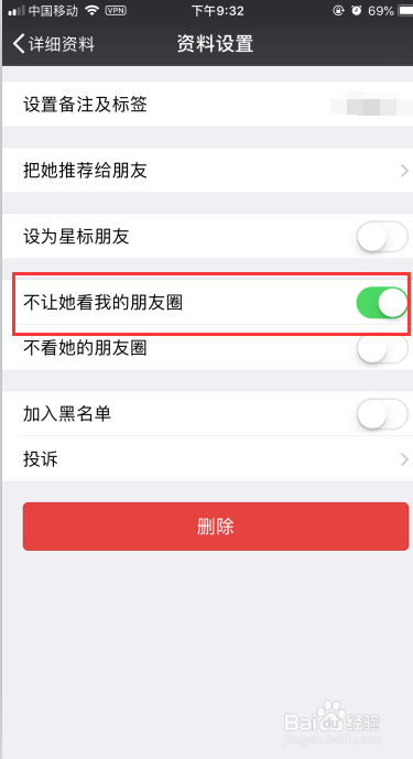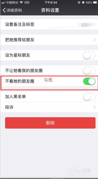 6. 设置朋友圈不成见:同样是在【自恋设置】页面下,勾选【不让他看我的朋友圈】,如图