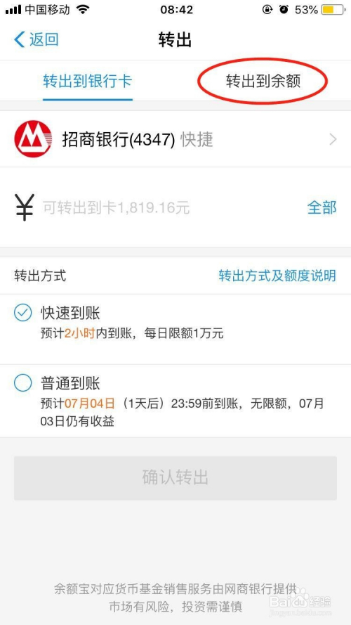默认的是转出到银行卡,可是这种体例到账会比力慢,我们选择“转出到余额”;