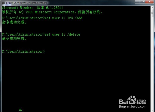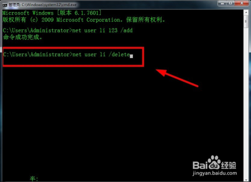 在号令提醒符中输入“net user li /delete”,按“Enter”键,显示“号令当作功完当作”