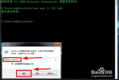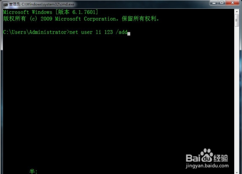 在号令提醒符中输入“net user li 123 /add”,按“Enter”键确定,显示“号令当作功完当作”