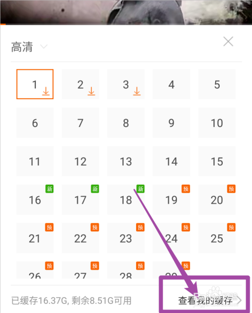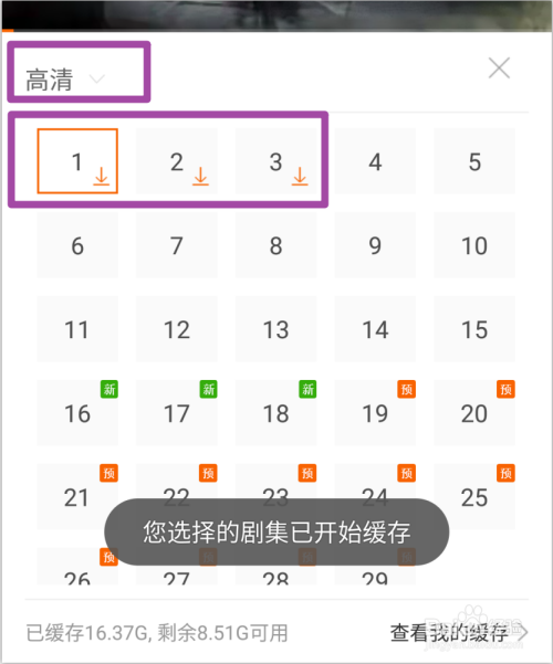 呈现缓存选项,点击选择好清楚度和视频,就起头缓存了