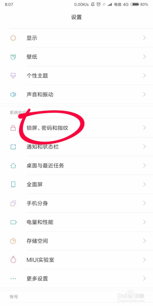 进入到手机设置页面之后,我们往下方滑动,找到锁屏解锁密码这一个选项,点击进入,如下图所示。