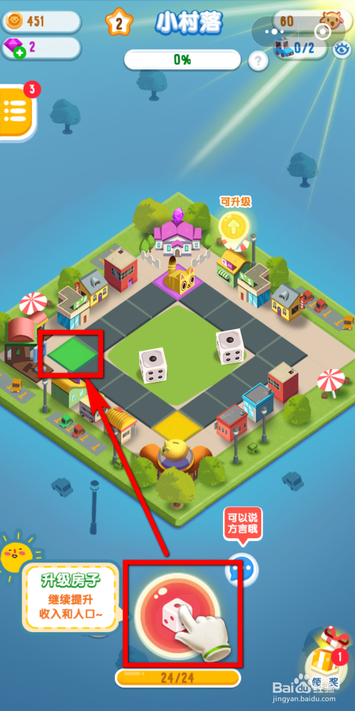 进入游戏后,点击图示手指位置的骰子,骰子数字为几你就会跳几步,若是正好跳到了图示位置的绿色区域中就会有辆车来接你。