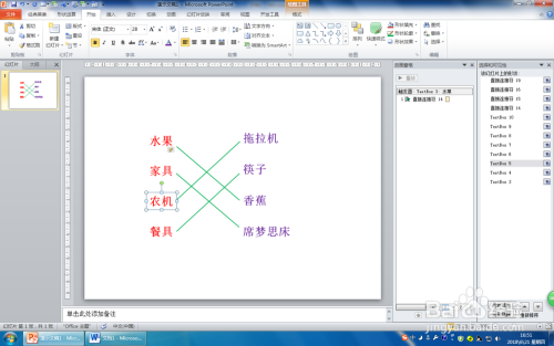 第六步:单击第一条连线,单击“动画”选项卡,在“高级动画”组中单击“触发”按钮,接着选择“单击”、左边第一个标题问题文字的名称,好比这里“生果”对应的是“textbox3”。其他几个连线按同样的方式设置即可。如许,放映PPT时单击哪个标题问题出来哪个连线。