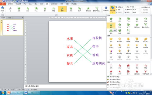 第二步:选中第一条连线,单击“动画”选项卡,在“高级动画”组中单击“添加动画”按钮,在弹出的下拉列表“进入”类别中选择“擦除”。