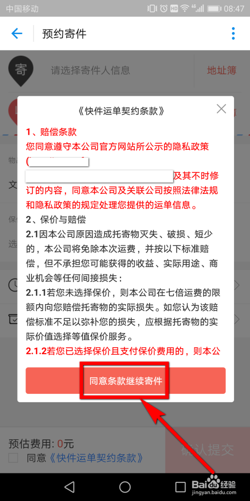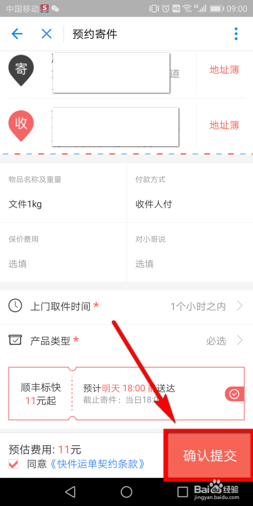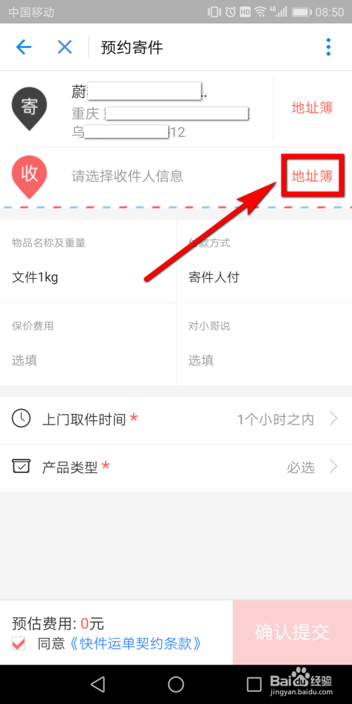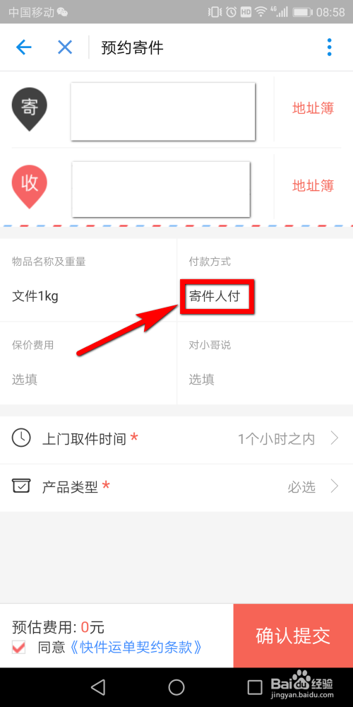 填写好收件人的信息后,又回到预约寄件页面,在页面图示位置点击付条目体例下面的【寄件人付】选项就可以选择付条目体例。