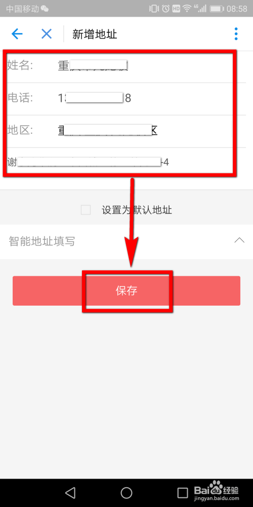 在新建地址页面填写好收件人的姓名、德律风、地域、地址等信息后,点击页面下方的【保留】。