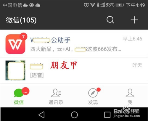 当作功登录微信账号后,其初始界面如下图所示,我们假设需求者“伴侣甲”需要“伴侣乙”的联系体例。