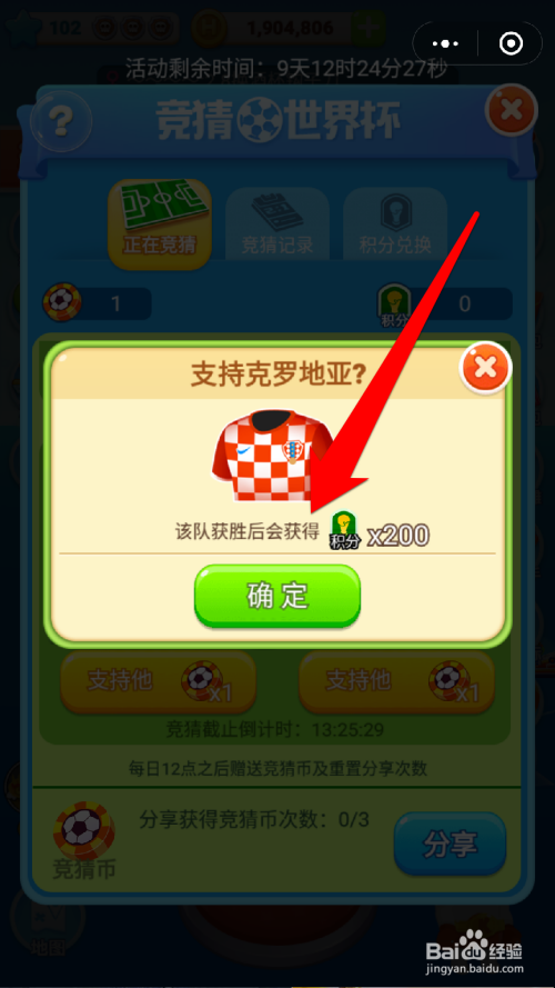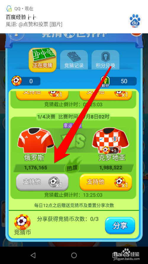 点击一个撑持的球队竞猜,这时系统提醒球队获胜后获得积分。