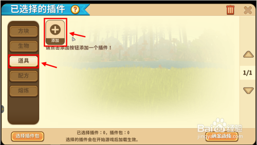 已选择的插件列表下,点击左侧切换到道具,然后点击右侧添加;