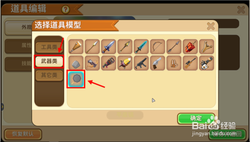 接下来的窗口中,左侧切换到兵器类,右侧选中平底锅图标并确定。