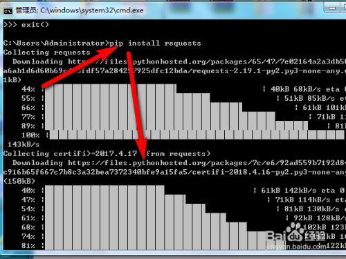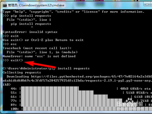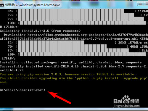 再次输入pip install requests,当作功啦,起头下载安装模块了。