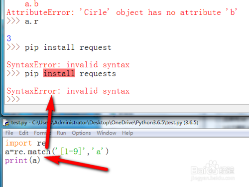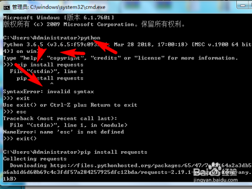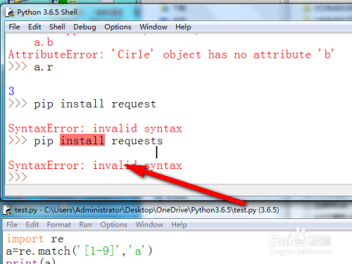 输入pip install requests号令,居然也获得了语法错误,SyntaxError: invalid syntax。