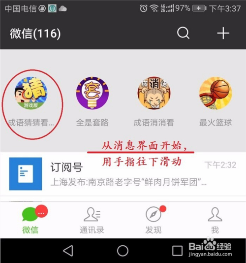 首先是找到“当作语猜猜看”游戏版,玩过一次后,在微信界面,用手指往下划,就能找到下图所示的图标。