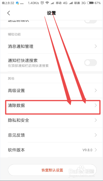 然后在打开的 设置 页面中找到 断根数据选项,点击进去;然后在打开的页面中按照需要选择,如 断根缓存、断根汗青记实 等等。