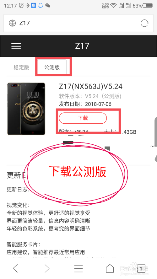 打开到Z17系统下载界面后,点击公测版,下载最新版系统。